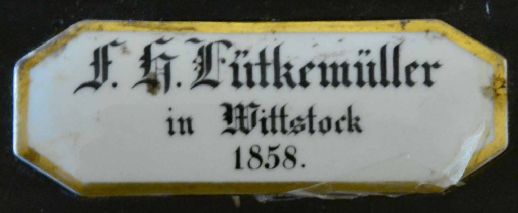 (1) Lütkemüller-Typenschild von 1858 an der Orgel in Groß Gievitz, Foto von 2011. Quelle: Peter Schmelzle, Wikimedia Commons, CC BY-SA 3.0.