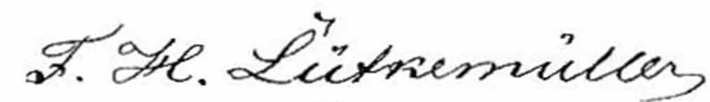 (2) Unterschrift des Orgelbaumeisters Friedrich Hermann Lütkemüller, ohne Datum. Quelle: Friedrich Drese: Der Orgelbauer Friedrich Hermann Lütkemüller und sein Schaffen in Mecklenburg. Malchow 2010.